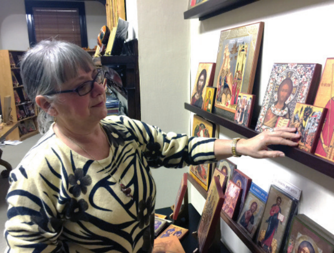Patty Bovee, manager of the Byzantine Seminary Press, adjusts icons at the store in Pittsburgh, Pa. Photo by David Mayernik Jr.